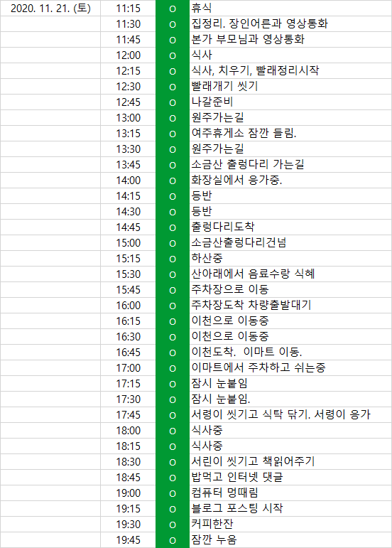 다음에 계획을 짤 때 참고할 수 있다. - 예를 들어, 이천에서 원주 소금산 출렁다리까지는 대략 45~60분 사이 걸린다. 화장실 응가는 15분 정도 걸린다. 식사하는 데는 대략 30분 정도가 걸린다. 아이를 씻기는 데는 15분이 채 안 걸린다.
