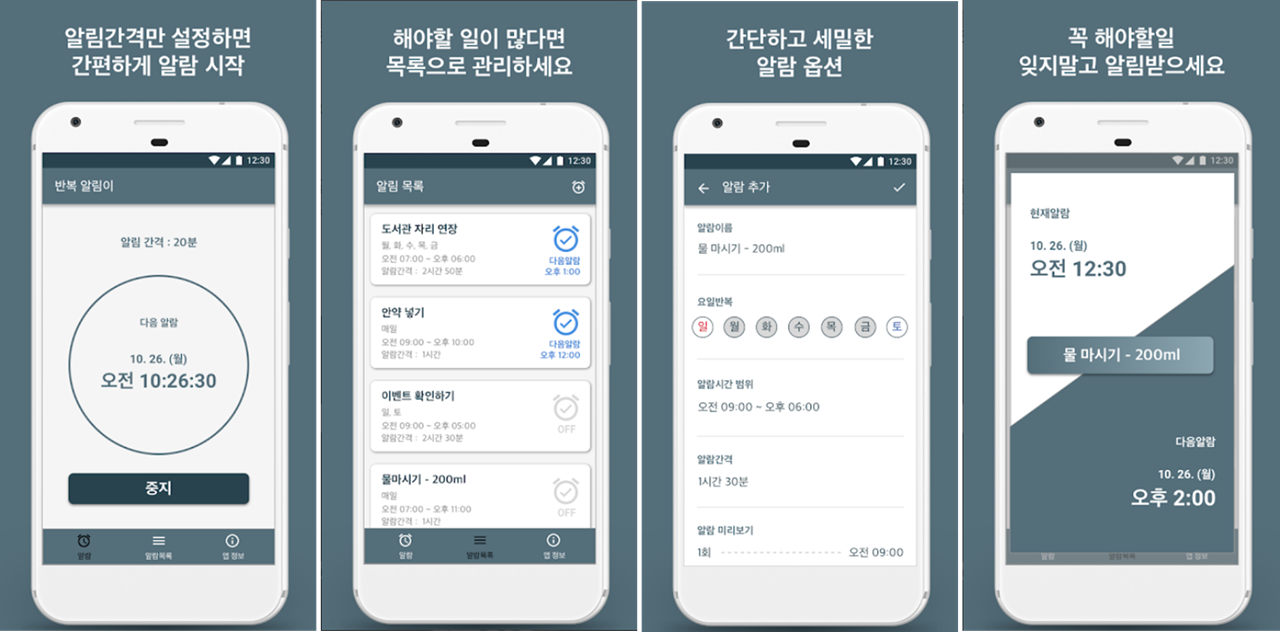 ◉ 무슨 앱인가요? 하루를 살다보면 반복적으로 해야 할 일이 있습니다. 이런 일들은 건망증 때문에 자꾸 잊기도 하고.. 계속해서 시계를 보며 확인하기도 힘들고.. 하루에 몇번씩 반복하는 일을