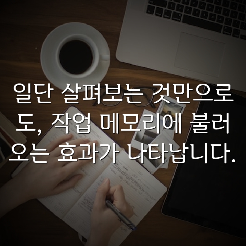 한편 일단 뭘 해야 하는지 들여다 보기라도 하자는 마음으로 살펴보면, 그 일이 작업기억에 들어오게 되면서 다음 스텝으로 나아갈 심리적 부담이 덜어지는 효과가 있다는 겁니다. 도미노같이 하나가 해결되면 그 다음으로 넘어가고, 이런 식으로 일단 시작해 보자는 거죠.