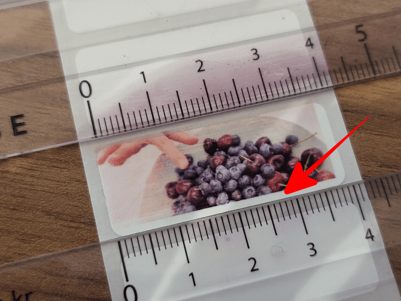 가이드레일의 아랫부분과 스티커용지의 아랫변을 맞추면 위처럼 인쇄됩니다. 빨간 화살표 보세요. 틈새가 약간 있지요.