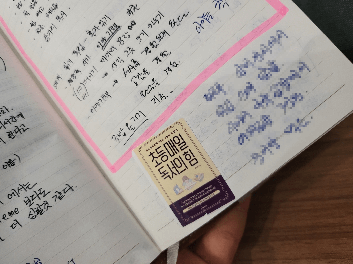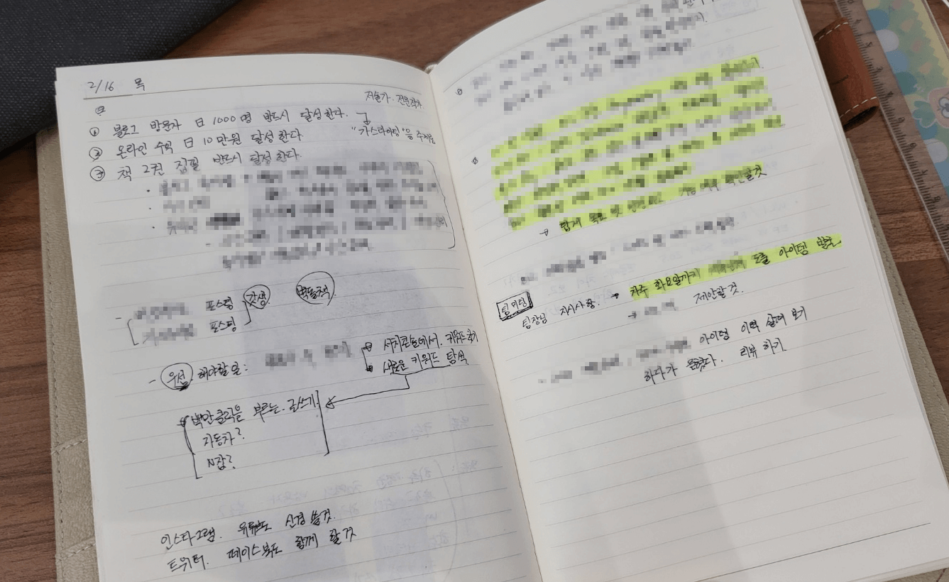 요즘은 "흰 것은 종이, 검은 것은 글씨" 라는, 메모 형식의 노트에서 조금 더 진화해 보려고 노력 중입니다. 글자도 조금 또박또박 쓰려고 노력하고 있고, 중요한 사항들은 형광펜으로 하이라이팅도 하면서, 시각적으로 가독성을 높이기 위해 노력하고 있어요.