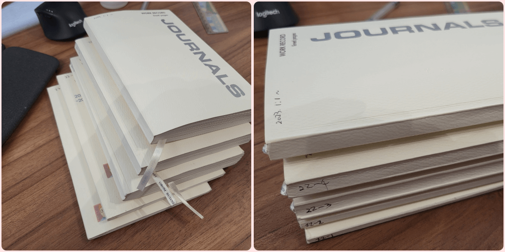그래서 벌써 네 권인가 다섯 권 다 사용했고, 지금 사용하고 있는 노트는 올해 1월 1일부터 사용하기 시작한 건데, 아마 이번 분기 안에 끝날 것 같습니다. 이번 노트가 다 끝나면 다음에는 320페이지짜리 좀 더 두꺼운 노트로 사용해볼까 생각 중이에요.