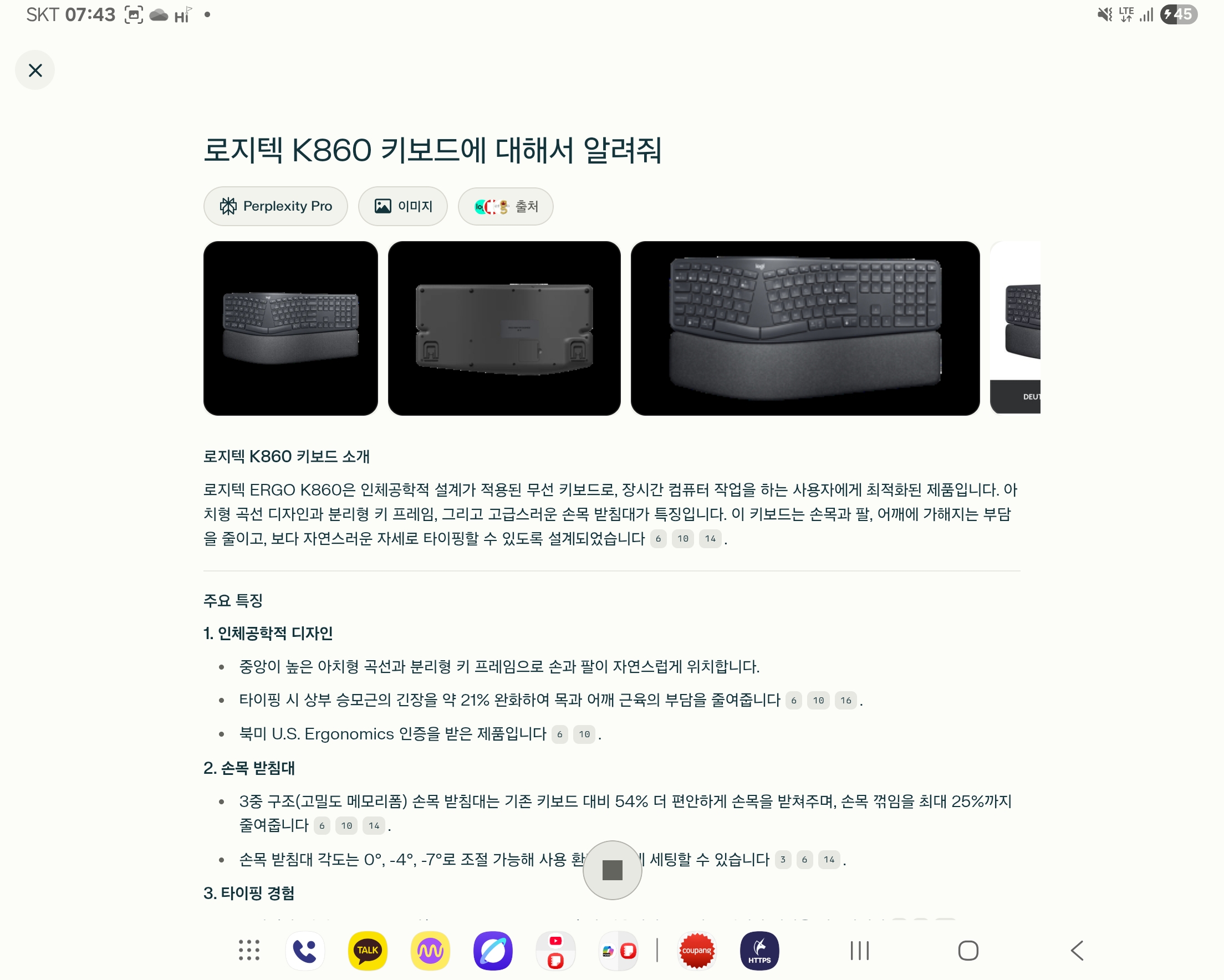 퍼플렉시티를 사용하면 꽤 그럴싸한 초안을 만들어 주기 때문에, 거의 손댈 부분이 없는 수준까지 글을 만들 수 있습니다. 하지만 저는 블로그에 올리기 전에 꼭 제 말투로 다시 한번 다듬는 과정을 거칩니다. 그래야 글이 자연스럽게 읽히고 이질감이 없더라구요. 저는 로지텍 K860 인체공학 키보드를 이용하고 있는데, 손목 부담 없이 정말 편안하게 이용할 수 있어서 거의 전도사가 되고 있습니다. 아래 링크를 통해 구매하시면 로켓배송이라 내일 받아보실 수 있으니까 참고하시면 됩니다. ^^
