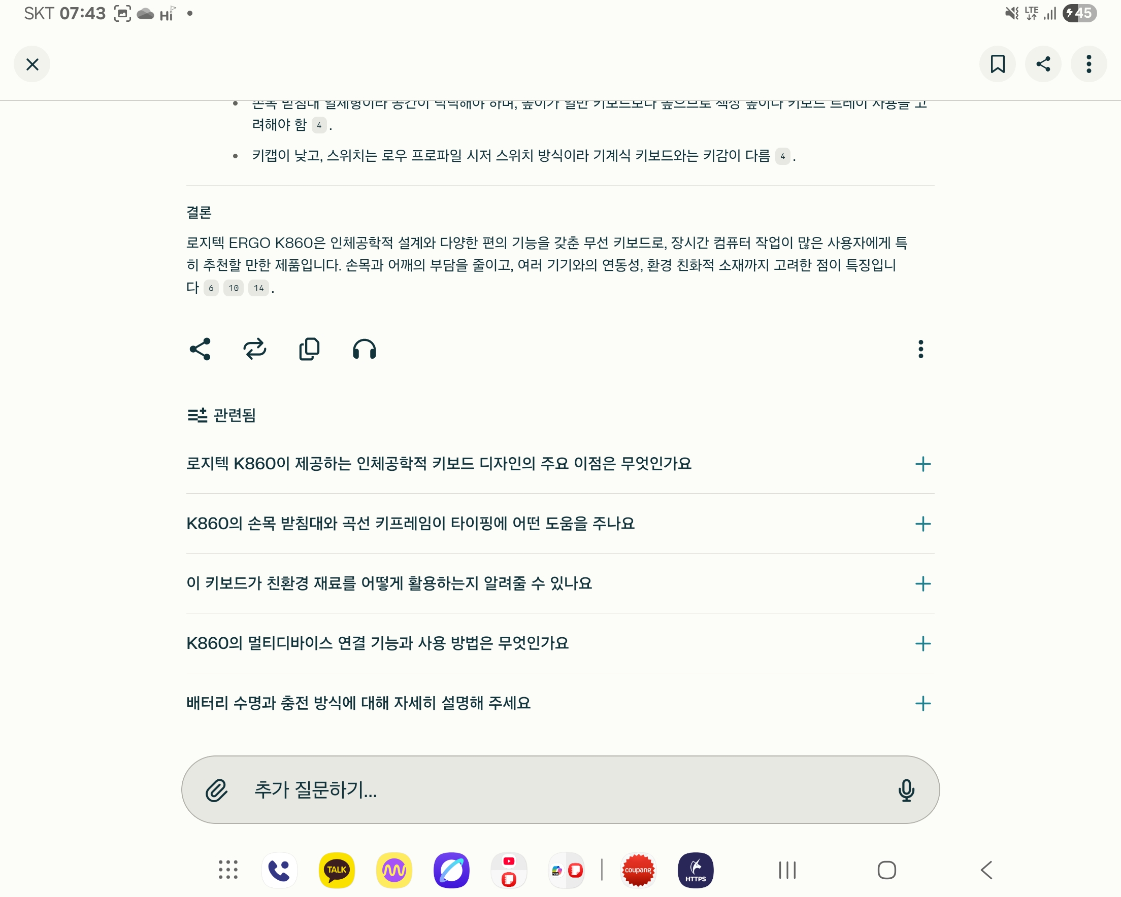 퍼플렉시티는 연관질문을 자동적으로 추천해주는 기능이 있어서, 어떤 개념에 대해 사람들이 무엇을 궁금해하는지를 자연스럽게 따라갈 수 있습니다. 예컨대 로지타게 K860 키보드에 대해 그냥 막연하게 알려달라고 질문을 하면, 다음과 같이 결과값을 조사해서 내보낸 뒤에, 자연스럽게 연관 질문을 추천해 줍니다.