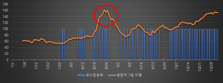 특이한 것은 큰 트래픽이 가라앉고 나서, 저점이 70명 중반에서 지지되고 있다는 것이었습니다. 그리고 9월달에는 포스팅 빈도를 조금 더 높일 수 있었고요, 2~3일 간격으로는 계속 쓰려고 노력했었습니다. 부침은 있었지만 저점을 이어보면 완만한 상승세였다는 것을 알 수 있었어요.