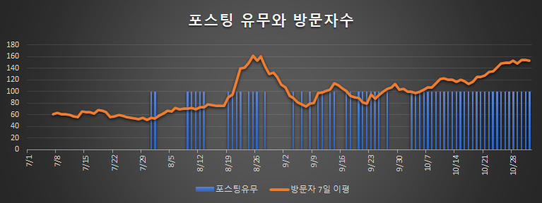 그리고 10월 3일부터는 하루에 한두 개씩 포스팅 하려고 노력했고, 저점을 이어보면 상승세가 조금 더 올라간 것 같습니다. 지금은 일별 100명 초~중반대의 방문자 분들이 찾아 주고 계시고, 최근에는 약 140분 정도 유입되는 것 같습니다.