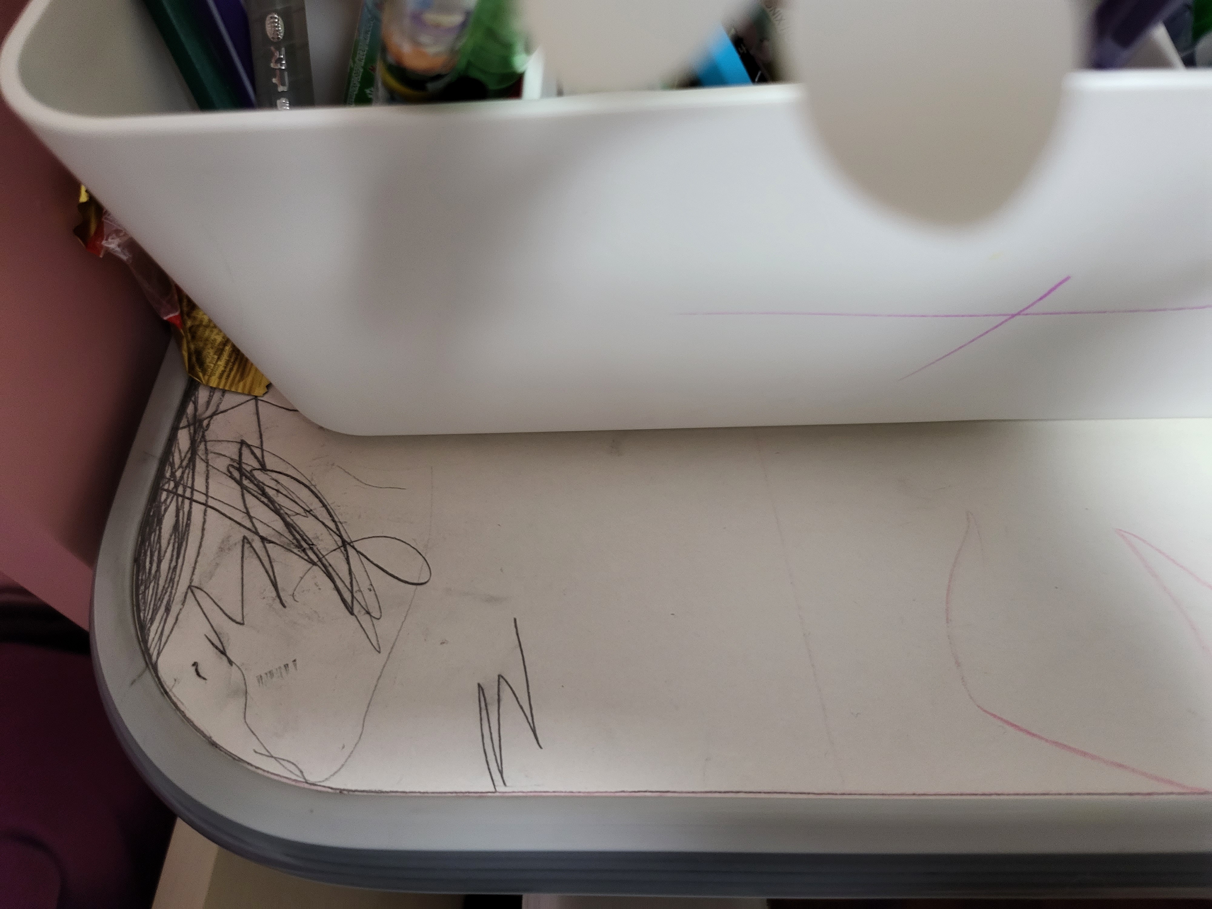 이런 일이 벌어질 수가 있나 싶어서 일반 물티슈로 열심히 문질러 보았더니 전혀 반응이 없었어요. 다시 눈을 의심하고 매직 스펀지로 문질러 보았더니, 쓱쓱 문지르기만 해도 깨끗하게 지워지는 것이었습니다. 저한테 책상 닦으라고 할까봐 걱정을 했지만, 결국 제가 신나게 닦았습니다.